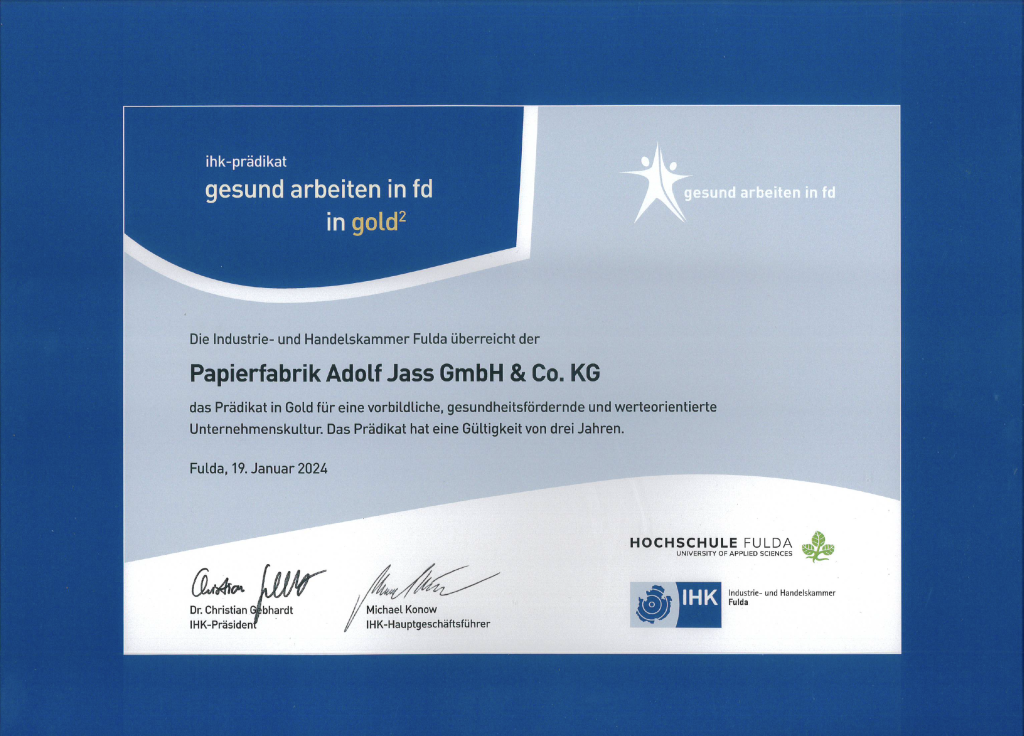 Jass was awarded the coveted gold rating “Gesund arbeiten in FD” (Healthy Working in FD) by the Fulda Chamber of Industry and Commerce. This award not only underlines the importance of holistic health management in companies, but also recognizes the commitment to the well-being of its employees.