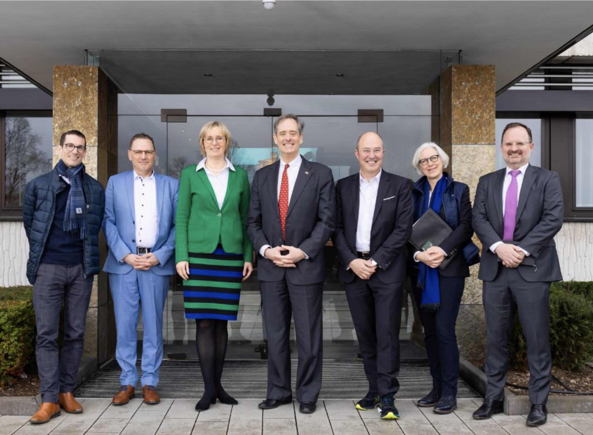 Wszyscy uczestnicy wizyty w JassPaper (od lewej do prawej: dyrektor generalny Izby Przemysłowo-Handlowej Michael Konow, doradca energetyczny Jass Uwe Gaßmann, dyrektor zarządzająca dr Marietta Jass-Teichmann, konsul generalny USA Norman Thatcher Scharpf, dyrektor handlowy Frank Gumbinger, ekspertka ds. ekonomicznych w dziale polityki i gospodarki dr Kinka Gerke, zastępca kierownika działu polityki i gospodarki William Evans)